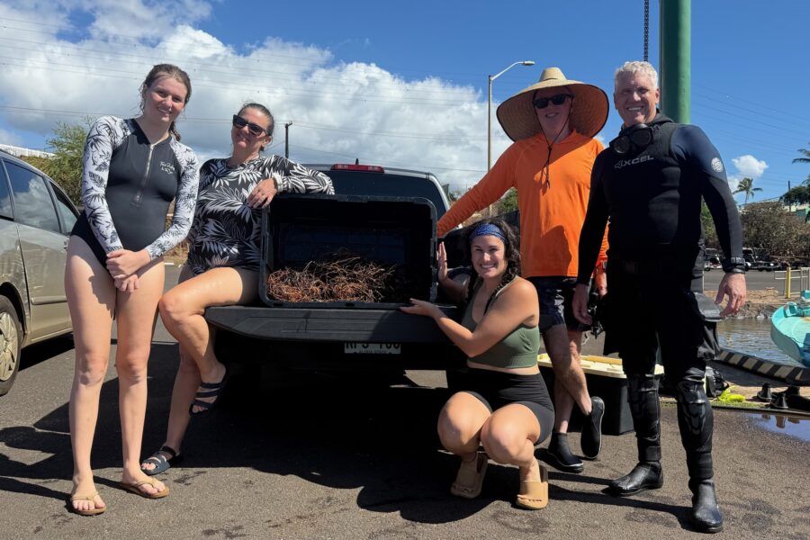 MNA spent two days on the water off a popular west-side fishing area, removing fishing line, lead weights and other debris. Many live corals in this area get tangled in the line and die, and there are also entanglement problems with turtles, monk seals, and even some large fish like sharks. This site is only accessible by boat, so the per-day cost is very high. These efforts were paid for by an MNA donor. Maybe you can help pay for the next trip!